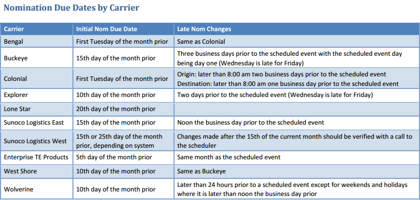 Below you will find the Nomination Due Dates by Carrier. The list was created as a convenience and dates are subject to change by the carrier at any time.