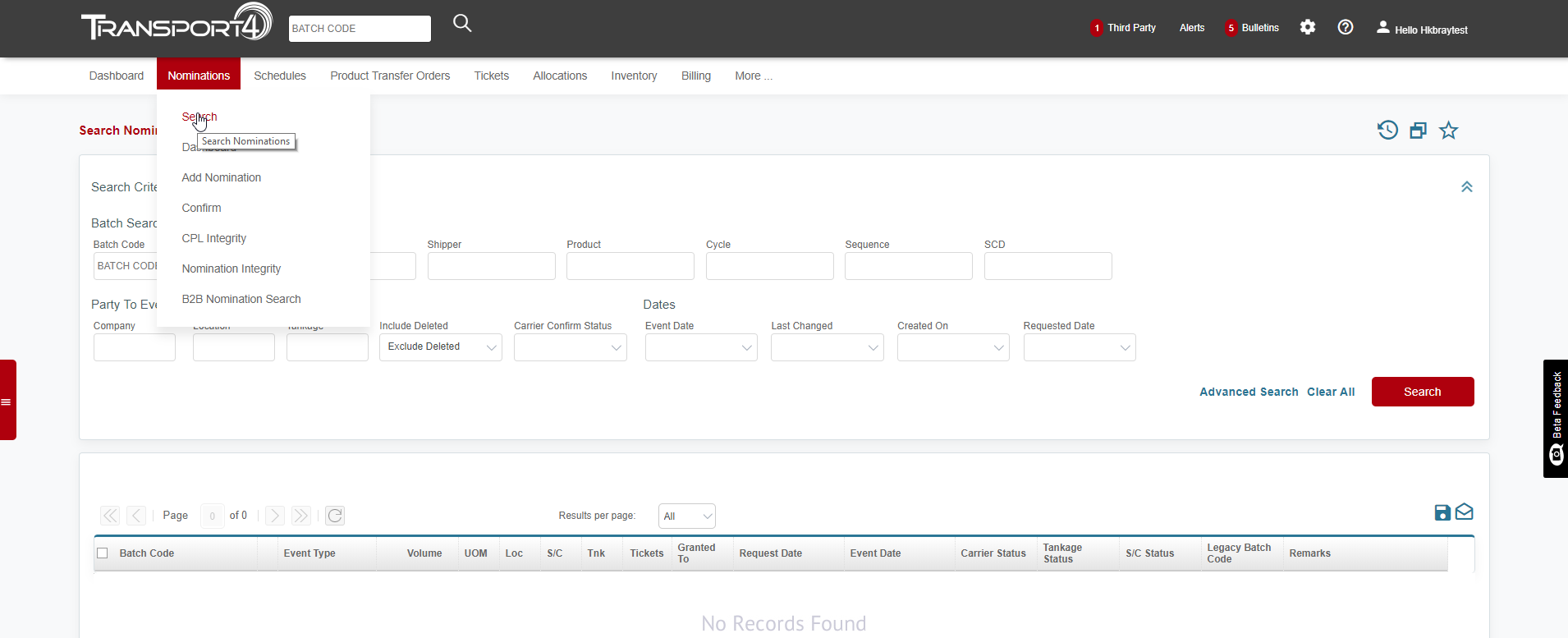 Hover over “Nominations” from the T4 Dashboard. Then click “Search” or click directly on “Nominations”.