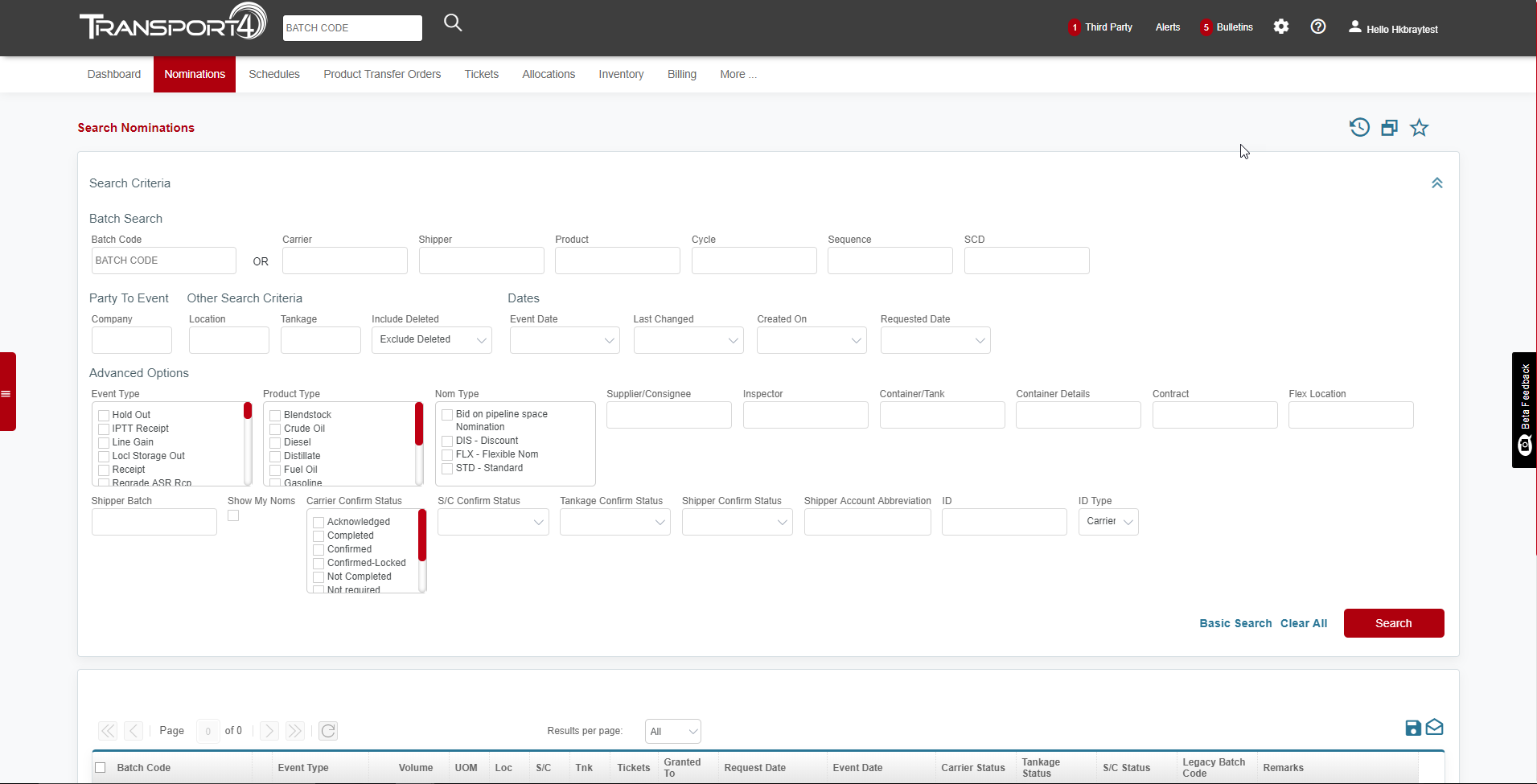 The Nomination Search screen is used to search previously entered Nominations. There are two search options; Basic (default) or Advanced Search.