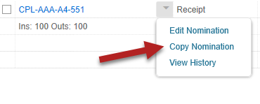 - You will use the same drop-down box you used to edit a Nomination. In the drop-down window click “Copy Nomination” or you can search the Batch Code and click “Copy”.