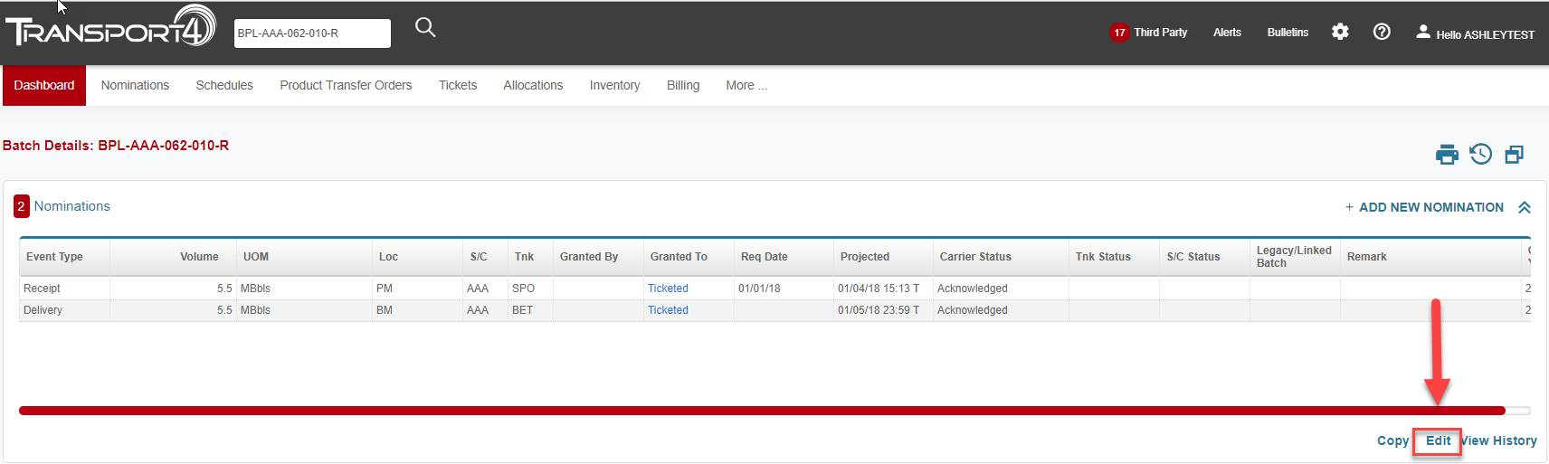 The Context Menu allows the shipper to Edit, Copy, & View the nomination. Users can also access the version history from the context menu.