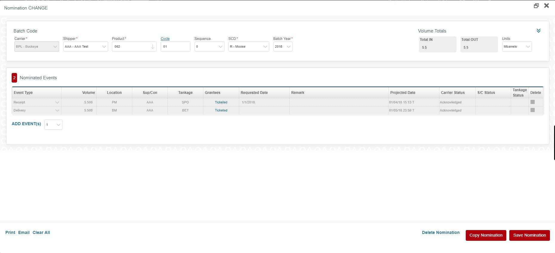The shipper can delete a Nomination by accessing it from the context menu or Batch Details screen