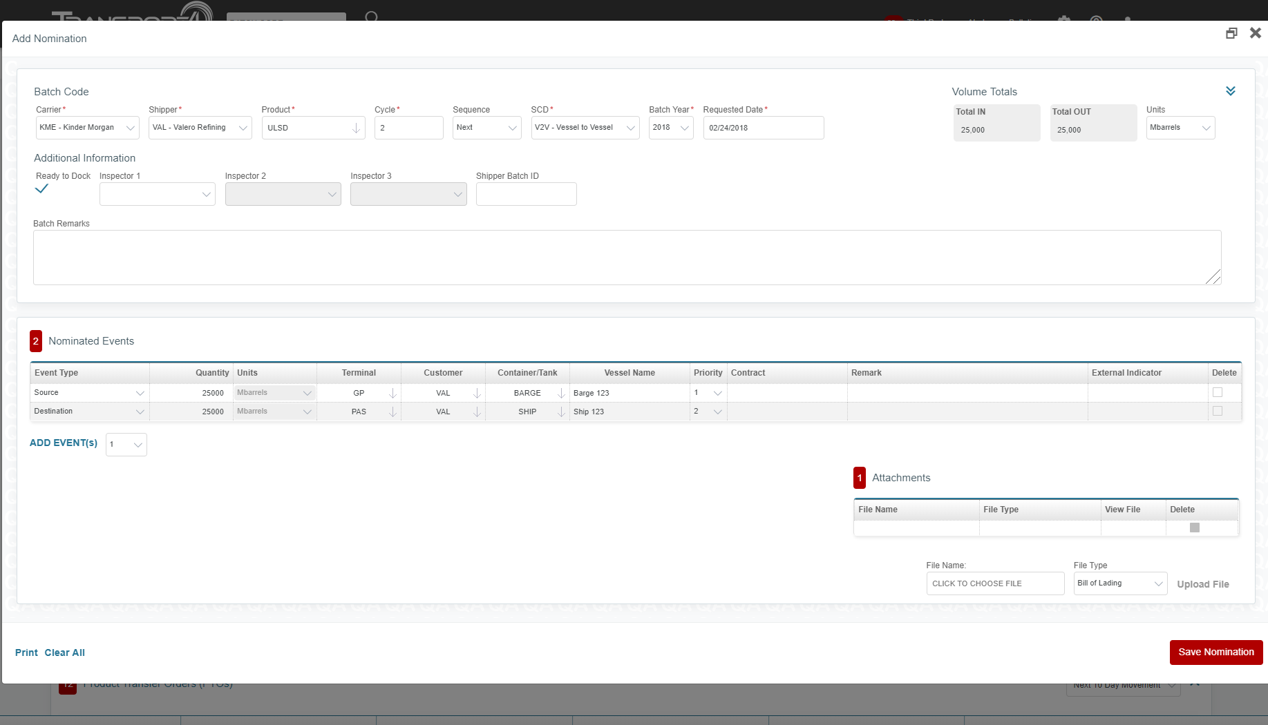 This article will cover Vessel to Vessel Terminal Nomination. For an overview of Terminal Nominations, please refer to the following article: Terminal Nominations Overview