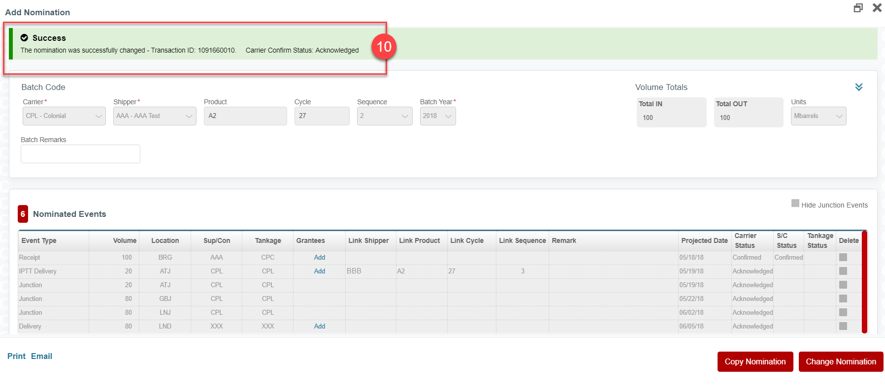 Seller/Transfer Originator AAA enters a Cycle 50 nomination of 100,000 barrels of A2 originating at Baton Rouge, BRG from Supplier AAA out of the Tankage of CPC and instructs Colonial to deliver the batch to Linden Delivery, LND. The Consignee and Tankage party at Linden have not been determined, thus both are entered as XXX.