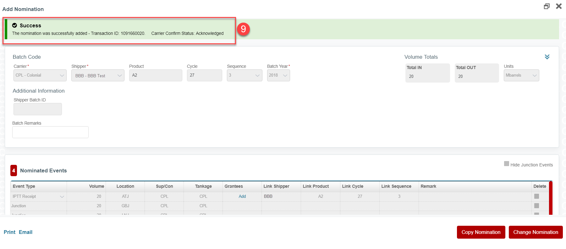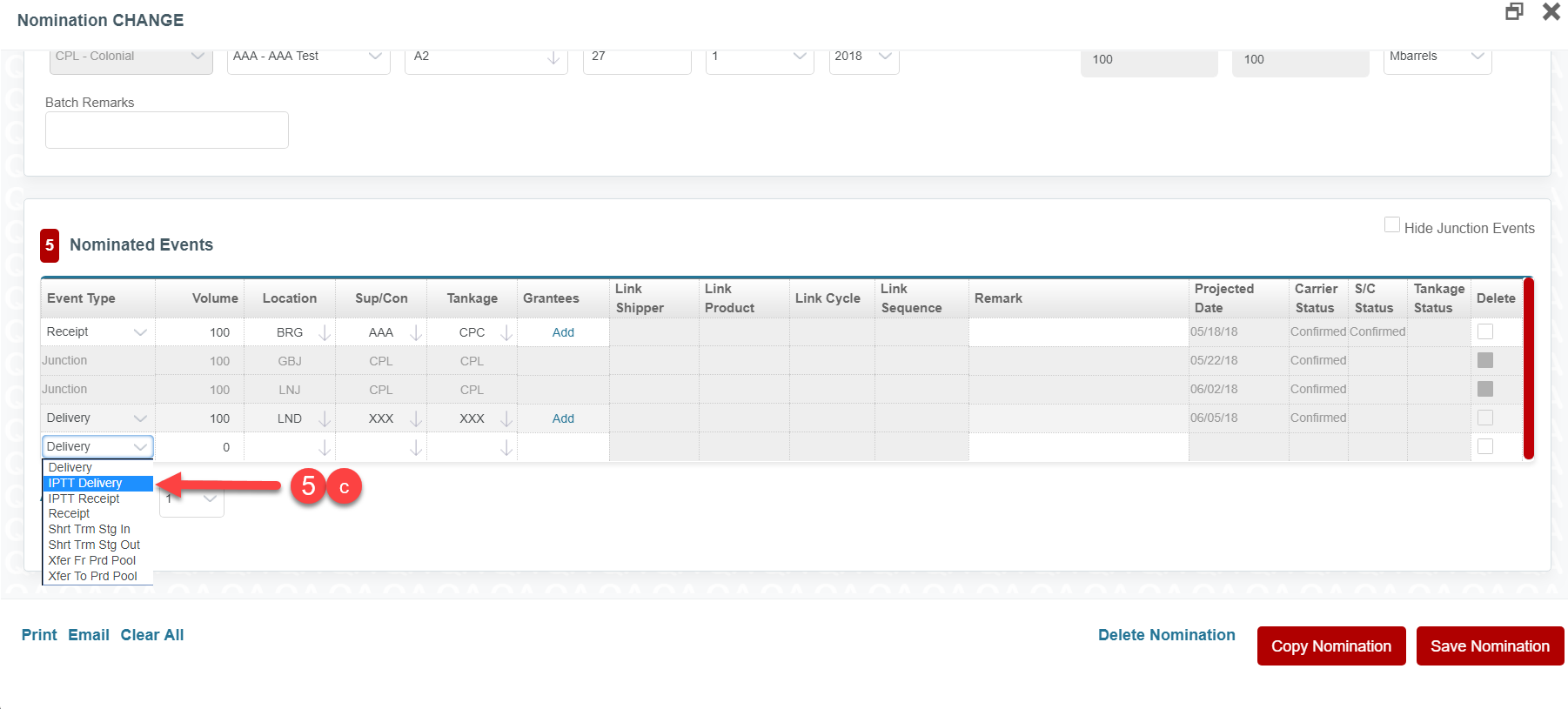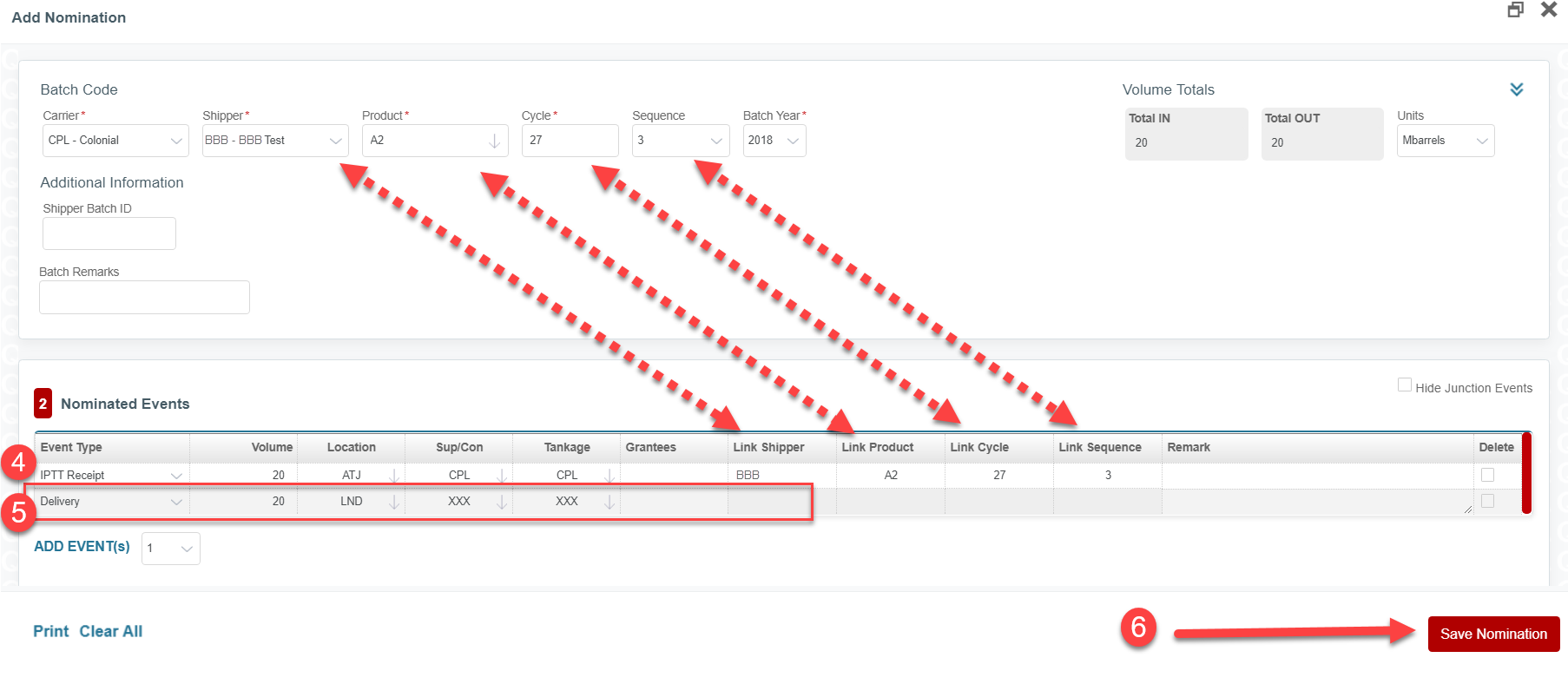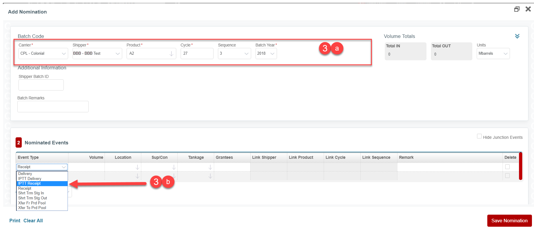 Step 3a. Enter the nomination for the volume of product to be purchased/transferred. The nomination Product must match the Seller’s/Transfer Originator’s Product. The nomination Cycle must match the Seller’s/Transfer Originator’s Cycle. The nomination Seq must be the Seq agreed upon with the Seller/Transfer Originator to be used in the Buyer’s/Transfer Recipient’s batch code.Step 3b. Select the IPTT Receipt event type for the Receipt of the product and the linked batch information for the Seller/Transfer Originator.