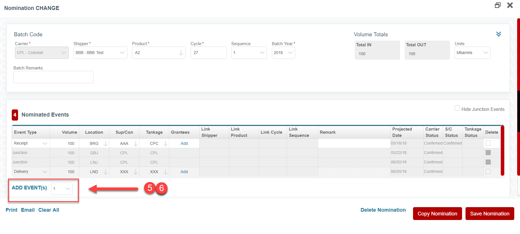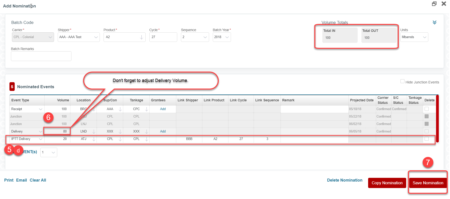 Step 6. Adjust the Delivery Event Type Volume by the transfer volume amount so the Total In volume still matches Total Out volume for the original nomination.
