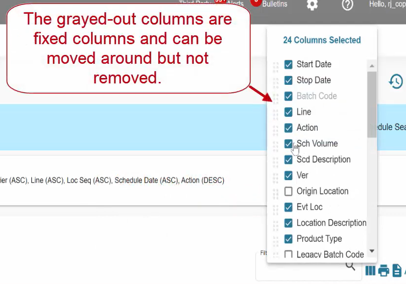 The grayed-out columns are fixed columns and can be moved around but not removed.