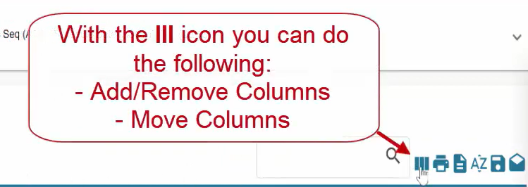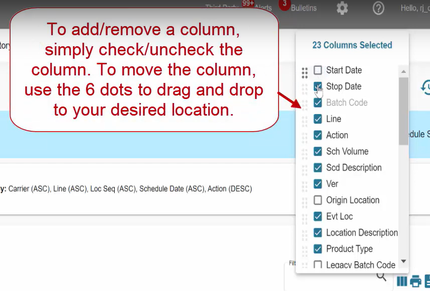 To add/remove a column, simply check/uncheck the column. To move the column, use the 6 dots to drag and drop to your desired location.