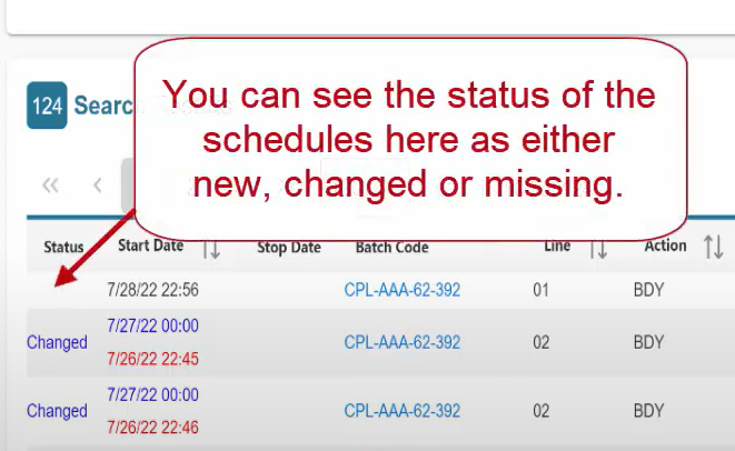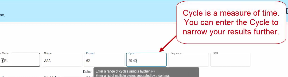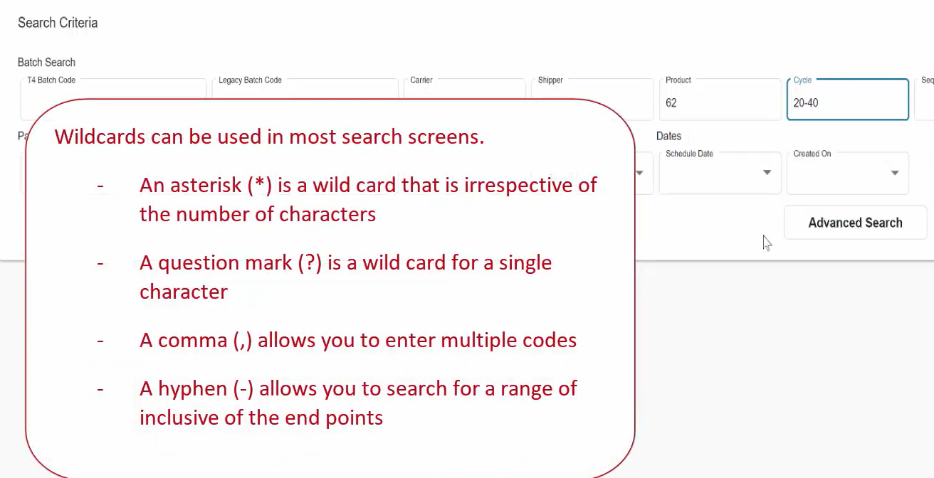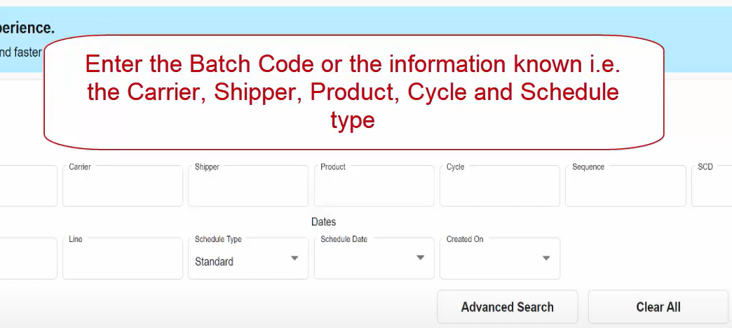 Enter the Batch Code or the information known i.e. the Carrier, Shipper, Product, Cycle, and Schedule type.