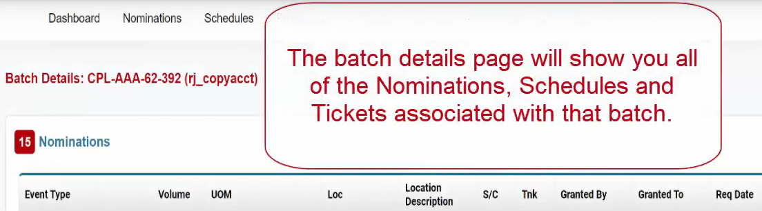 The batch details page will show you all of the Nominations, Schedules, and Tickets associated with that batch.