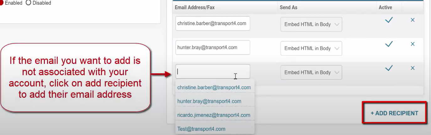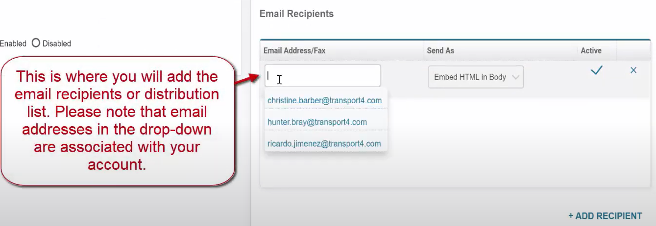 This is where you will add the email recipients or distribution list. Please note that email addresses in the drop-down are associated with your account.