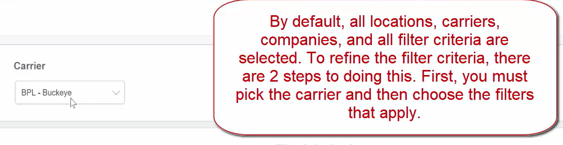 By default, all locations, carriers, companies, and all filter criteria are selected. To refine the filter criteria, there are 2 steps to doing this. First, you must pick the carrier and then choose the filters that apply.