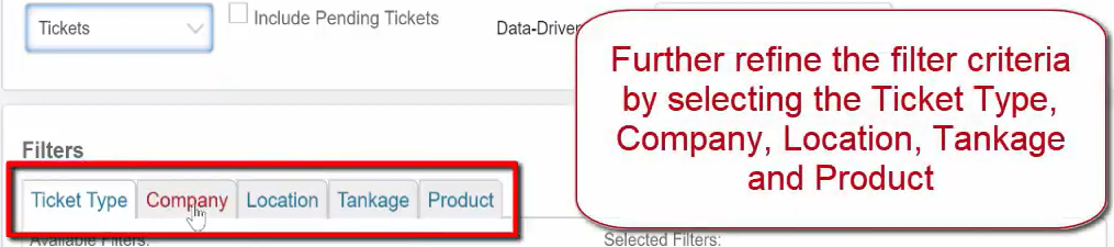 Further refine the filter criteria by selecting the Ticket Type, Company, Location, Tankage, and Product.