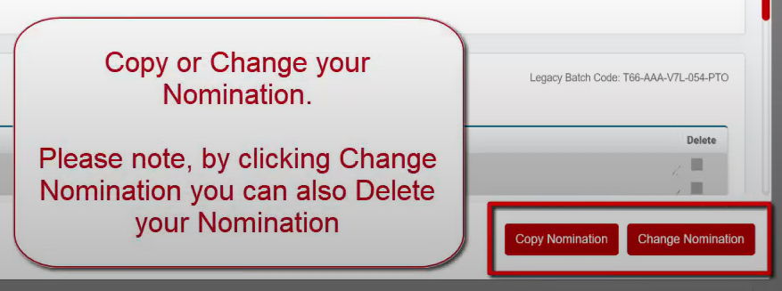Please note, by clicking Change Nomination you can also Delete your Nomination.