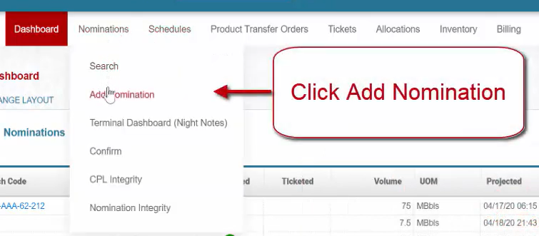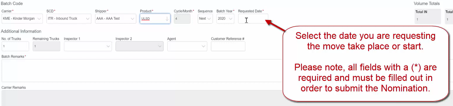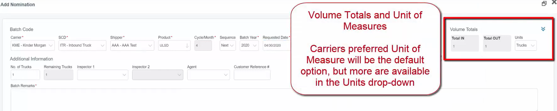 A Truck Nomination (for Terminals) is used to request a movement into/out of a truck going into or out of tank(s) at a Terminal.