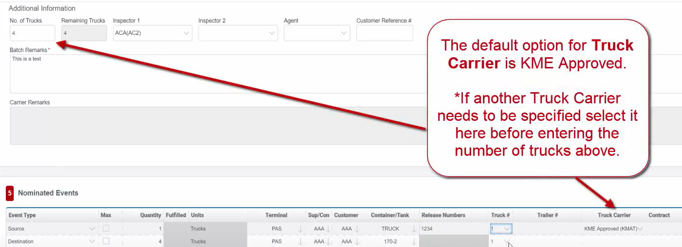 *If another Truck Carrier needs to be specified, select it here before entering the number of trucks above.