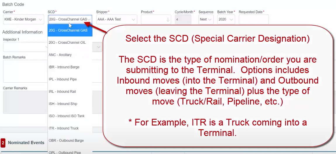 The SCD is the type of nomination/order you are submitting to the Terminal. Options include Inbound moves (into the Terminal) and Outbound moves (leaving the Terminal) plus the type of move (leaving the Terminal) plus the type of move (Truck/Rail, Pipeline, etc.)