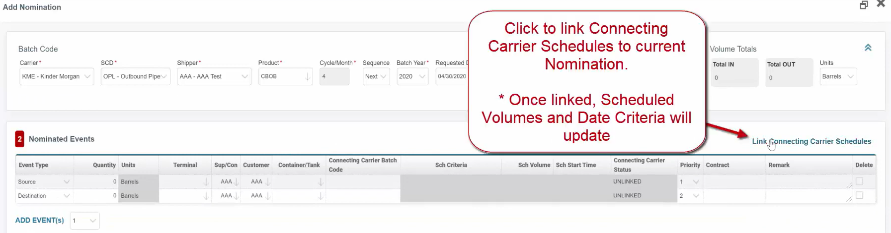 Click to link Connecting Carrier Schedules to current Nomination.