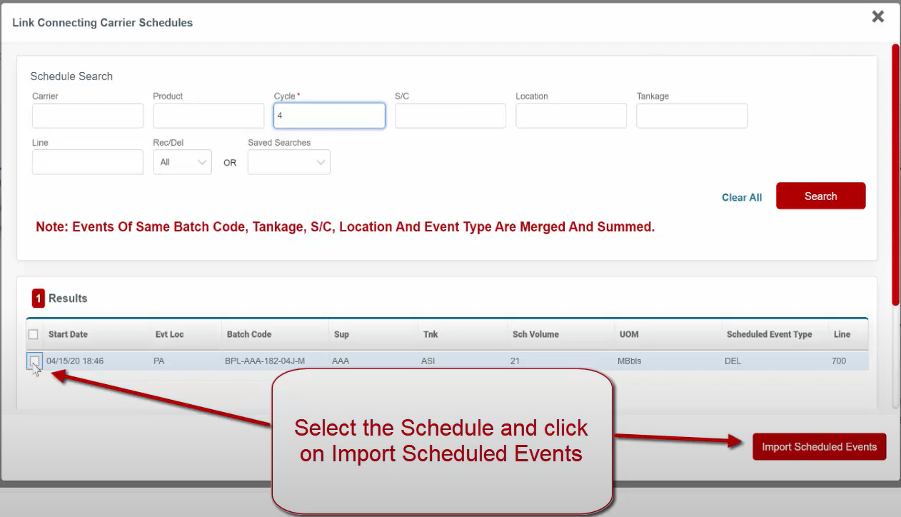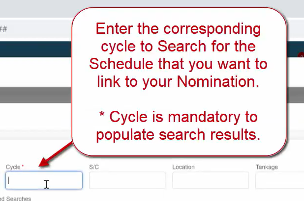 Enter the corresponding cycle to Search for the Schedule that you want to link to your Nomination.