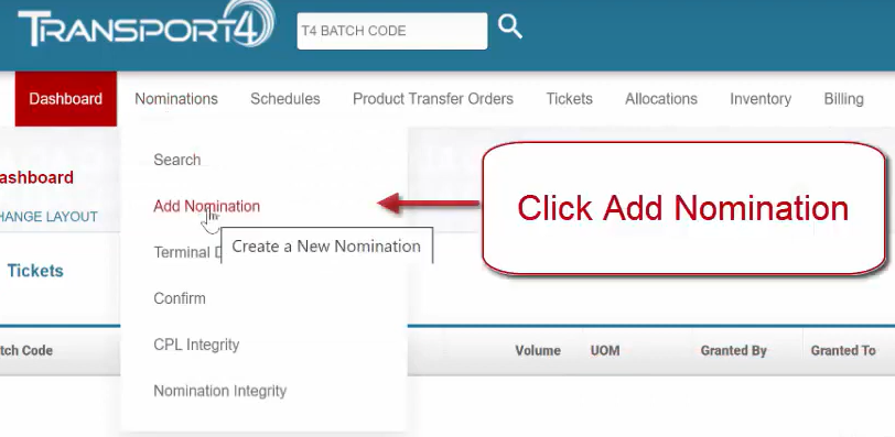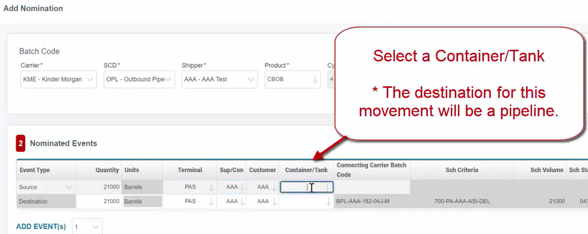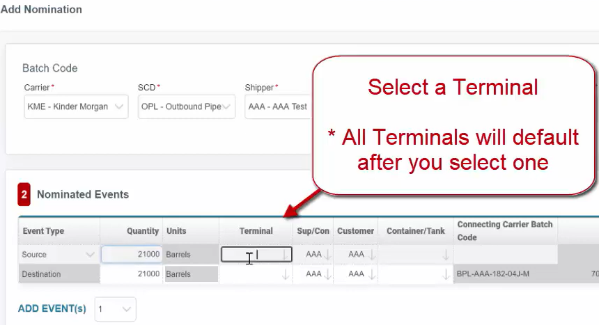 A Pipeline Nomination (for Terminals) is used to request a movement into/out of a Pipeline going into or out of Tank(s) at a Terminal.