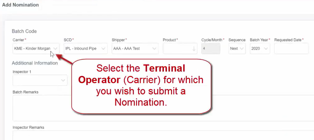 Select the Terminal Operators (Carrier) for which you wish to submit a Nomination.