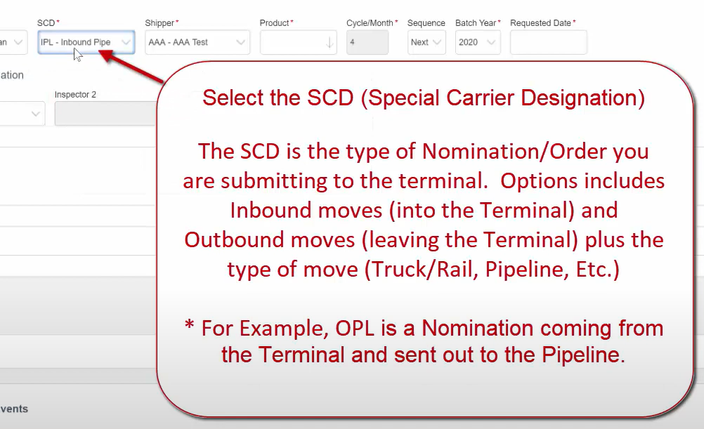 The SCD is the type of Nomination/Order you are submitting to the terminal. Options includes Inbound moves (into the Terminal) and Outbound moves (leaving the Terminal) plus the type of move (Truck/Rail, Pipeline, Etc.)