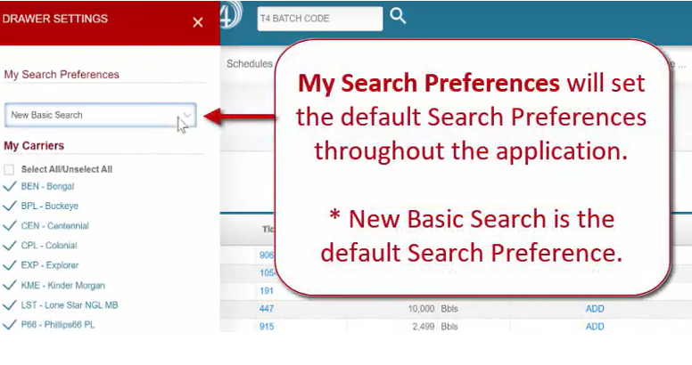 The Drawer, hidden on the left side of the website, slides out to enable the quick filtering and selection of Carriers and other Criteria. The Drawer is available on all pages of T4.