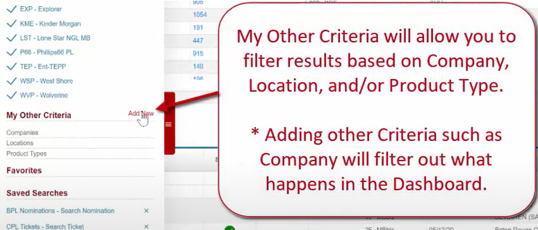 My Other Criteria will allow you to filter results based on Company, Location, and/or Product Type.
