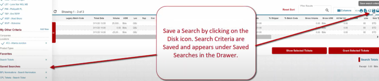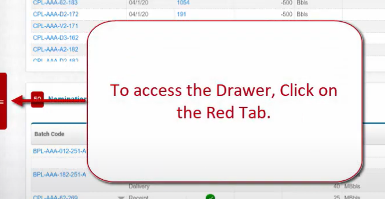 The Drawer controls the data displayed on the Dashboard and dictates the actions of searches on the following pages: Nominations, Schedules, Product Transfer Orders, and Tickets.