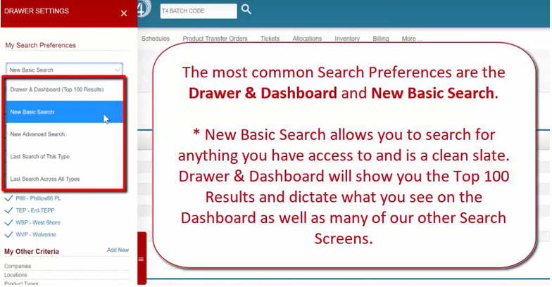 The most common Search Preferences are the Drawer & Dashboard and New Basic Search.