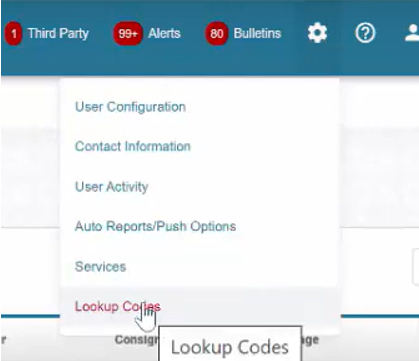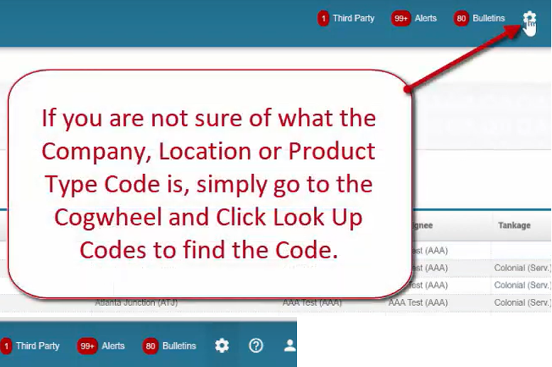 If you are not sure of what the Company, Location, or Product Type Code is, simply go to the Cogwheel and Click Look Up Codes to find the Code.