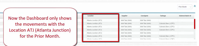 Now the Dashboard only shows the movements with the Location ATJ (Atlanta Junction) for the Prior Month.