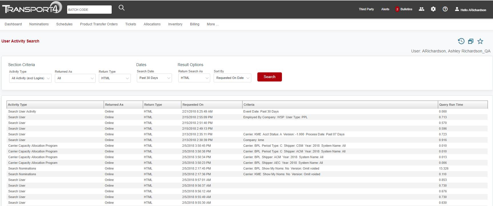 The “User Activity” section under the cogwheel allows you to view all of your activity in Transport4 for the last 11 months. There is quite a bit of criterion that you can search on. Once you have selected your criteria, click “Search”.