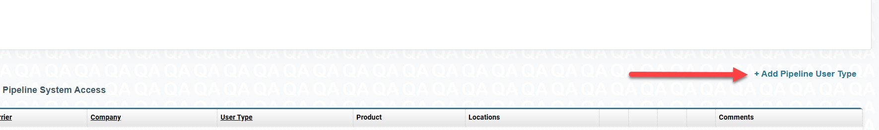 To assign pipeline user types, navigate to the User Configuration screen. The option to add user type access is located just above the Pipeline System Access section near the bottom of the screen.